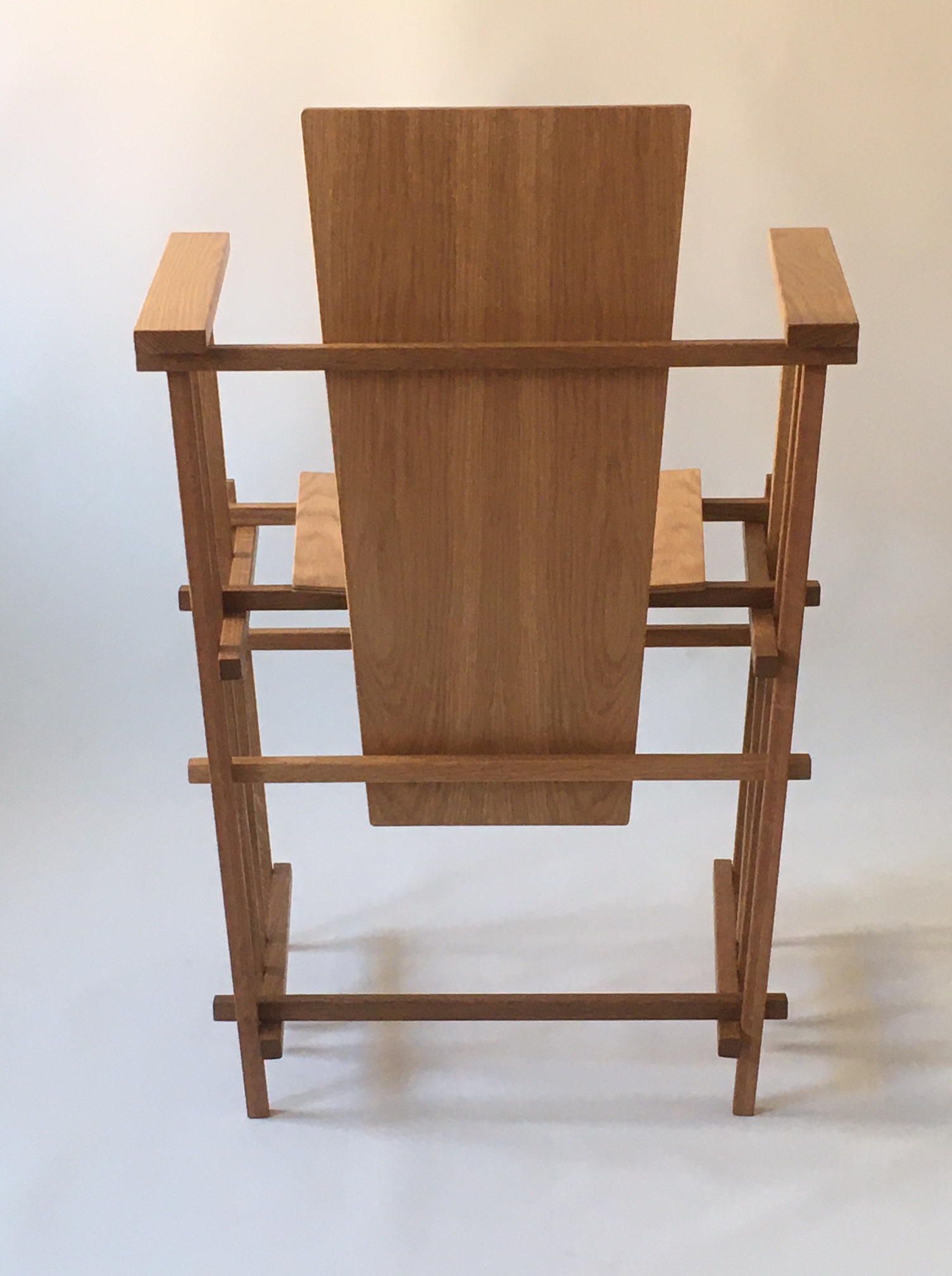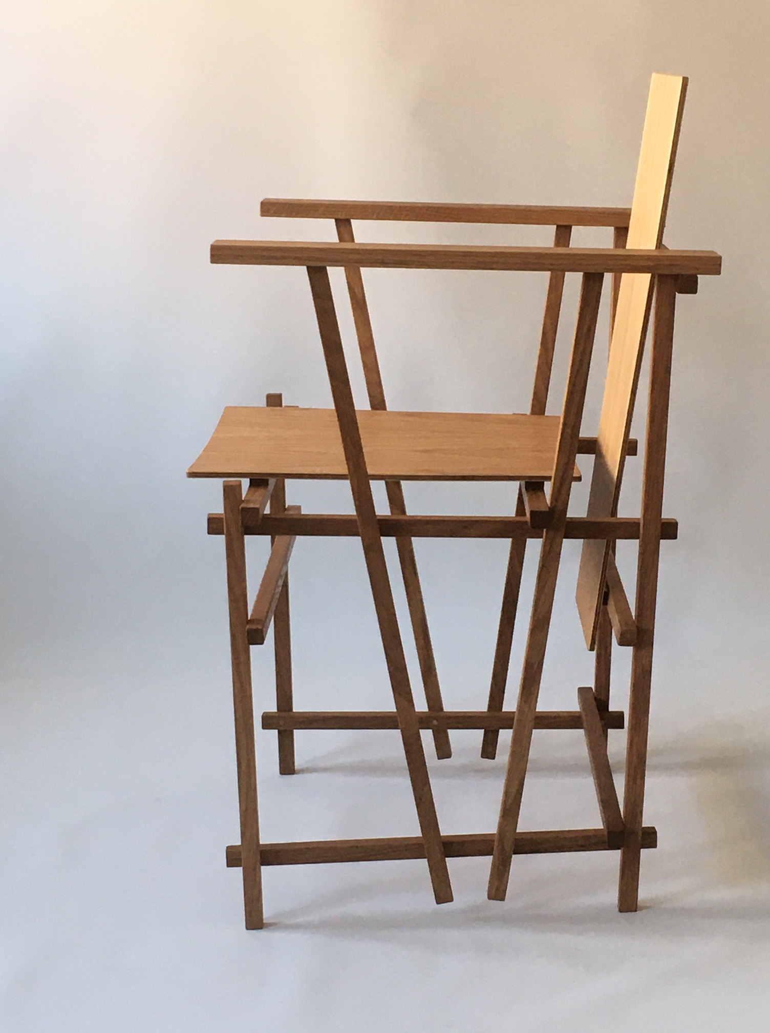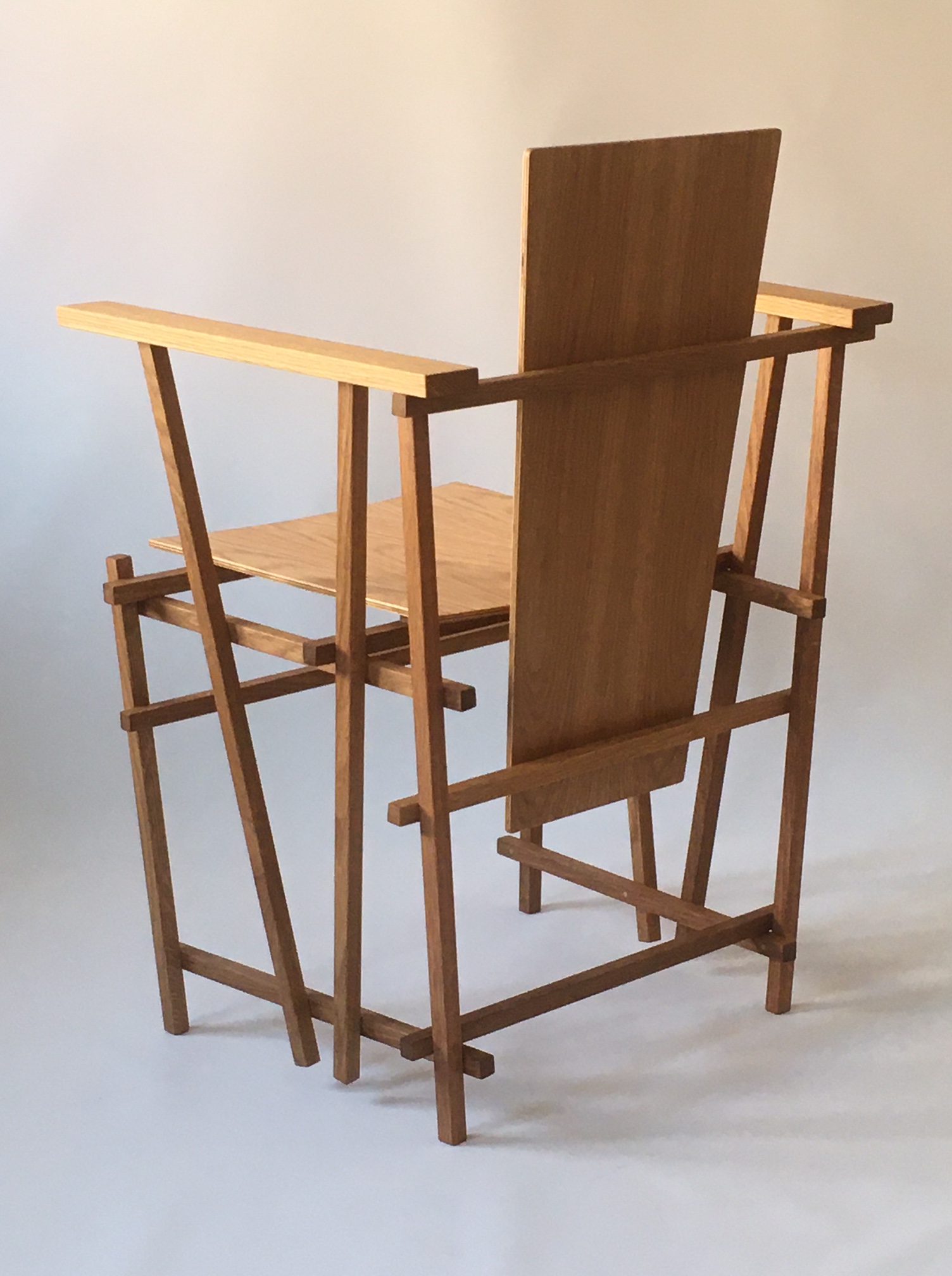 The frame of the chair is made of oak sticks (18×18 mm) – having one slanting side which dictates the main form of the chair. The seat and the back of the chair are made of plywood – birch and oak. The chair is treated with oil.